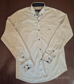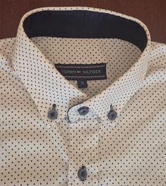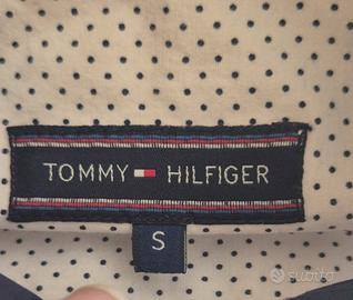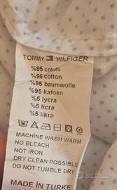 Misure in piano: Da spalla a spalla 39 cm Da ascella ad ascella 51,5 cm Maniche 62 cm Lunghezza 61 cm ATTENZIONE⚠️ PRIMA DI ACQUISTARE ASSICURARSI CHE LE.MISURE SOPRA ELENCATE CORRISPONDANO A QUELLE DI CHI INDOSSERÀ IL CAPO. Pari al nuovo. Camicia TommybHilfiger originale, caratterizzata da una raffinata micro-fantasia a pois su base chiara. Il capo è in condizioni impeccabili, usato pochissimo e pari al nuovo, senza alcun segno di usura. con pratiche fibbie interne alle maniche e bottone esterno, che permettono di arrotolare e fissare le maniche in modo ordinato per un look più casual. Alta Qualità: Tessuto composto al 95% Cotone e 5% Lycra. Questa composizione garantisce la massima traspirabilità unita a una leggera elasticità (stretch) che offre una vestibilità perfetta e un comfort superiore per tutto il giorno. Dettagli di Stile: Interno del colletto e dei polsini in blu a contrasto, visibili quando si risvoltano le maniche. Logo Tommy Hilfiger ricamato sul petto. Vestibilità: Slim Fit (taglio moderno e sagomato). Condizioni Ottime come nuova. Lavata e igienizzata con cura. Nessuna macchia, strappo o scolorimento