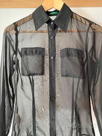 Camicia da donna, elegante, trasparente, in tinta unita nera. Presenti due taschini sul petto. In minuscolo buco è presente ed evidenziato in giallo, rimasto dopo che è stato levato l'anti-taccheggio.