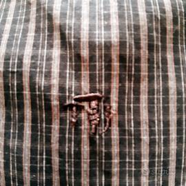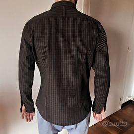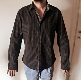 Vendo questa camicia del brand Trussardi jeans, Tg M, 100% cotone, di colore nero in prevalenza e righine marroni, di mio figlio che non la indossa più, in perfette condizioni e ricca di particolari interessanti, cominciamo dal colletto con stecche rigide, passante nel metà dietro per appenderla, polsini con 2 bottoni al polso e lungo manica, logo in rilievo sul davanti discreto ma evidente, taschino sul petto con finte asole, interno colletto e su attaccatura bottoni in rigato diverso, ultima asola al fondo orizzontale e infine 2 bottoni di riserva. La camicia viene consegnata lavata e stirata, se avete domande sono qui.