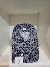 Camicia uomo in tessuto di cotone,di colore blu e bianco con fantasia floreale. Manica corta,colletto bowling e bottoni in corozo di colore blu. Camicia casual da indossare fuori,vestibilità slim.fit taglia 39