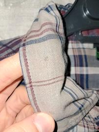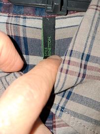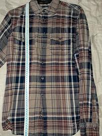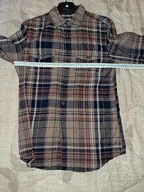 Vendesi camicia 100% cotone marca Benetton. Presenti due tasche con bottone sul petto. Colori marrone, blu, rosso scuro. Presente una macchia sul colletto (vedasi foto). Taglia S