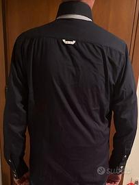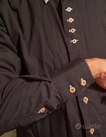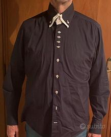 Camicia da uomo in cotone, taglia L. Presenta un colletto particolare con dettagli. Cucitura bottoni in filo rosso che si abbina all’interno dell’articolo. Made in Italy, 100% cotone.