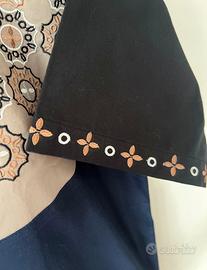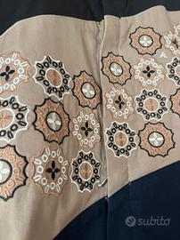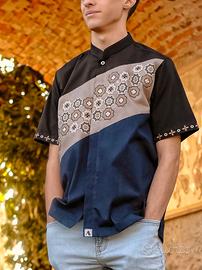 Nuovo senza cartellino, camicia uomo manica corta con ricamo fiori su cotone nero marrone chiaro e blu marino. Elegante ed unica nel suo genere, vestibilità leggera, elegante per le serate estive. Colletto coreana, bottoni a scomparsa. Made in Indonesia
