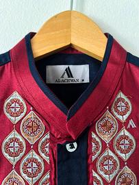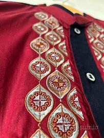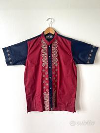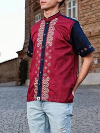 Nuovo senza cartellino, camicia uomo manica corta con ricamo fantasia gocce ricamate in oro e argento su cotone borgogna. Elegante ed unica nel suo genere, vestibilità leggera. Colletto coreana. Made in Indonesia