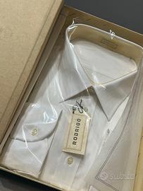 Bellissima camicia uomo, ancora nella scatola, taglia 47, in cotone bianco, alta qualità. Marca Rodrigo. Larghezza spalle 52 cm, larghezza da ascella ad ascella 70 cm, lunghezza da spalle 75 cm, larghezza fianchi 72 cm.