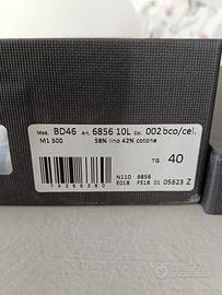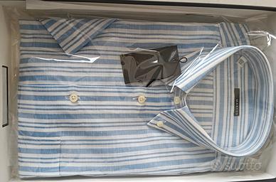 Camicia uomo a maniche corte nuova, nella sua scatola originale e con il cartellino. Misura del collo 40, corrisponde a una M, a righe azzurre e bianche. Materiale: lino e cotone.