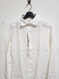Camicia uomo in puro lino irlandese, di colore bianco. Colletto francese,chiusura centrale con bottoni di madre perla. Vestibilità slim fit,taglia 44 equivalente alla taglia XXL.