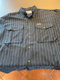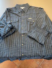 Camicia Uomo sportiva manica lunga Columbia a quadretti blue e righe bianche con due tasche con chiusura bottoni lato frontale corto. Con maniche che si arrotolano e si fermano con bottone. Fornita con bottoni di ricambio originali.