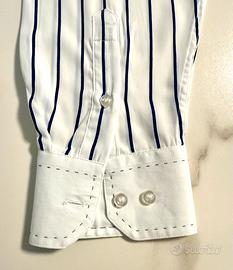 Bellissima camicia uomo a righe GOLDEN TIME, bianca con righe verticali blu, taschino sul petto, lavorazione accurata e particolare su collo e polsini, leggera e sembra seta sulla pelle e "cade" benissimo su di essa. Vendo con dispiacere perché un po' grande per me. Larghezza spalle 52 cm, larghezza busto 64 cm, lunghezza maniche 62, lunghezza camicia 75 cm. Ottime condizioni.!!