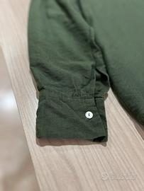 Camicia da uomo/donna color verde scuro, dal taglio morbido e leggermente oversize. Realizzata in tessuto leggero e traspirante, perfetta per la mezza stagione o le serate estive.