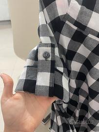 Camicia lunga in ottime condizioni, con bottoncini, maniche regolabili, taglia XS, a quadri bianco nero e grigio, scollo a V.
