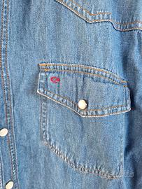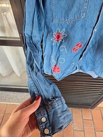 Camicia vintage in denim stile Western marca Exit Outwear taglia M/L, chiedere le misure corrette. il capo è caratterizzato da ricami floreali rossi e bianchi, si chiude con dei bottoni a pressione. i fiori sono ricamati a macchina e sono tipici della moda denim degli anni 70' e 80'. il tessuto é 100% cotone e la vestibilità è oversized. in ottime condizioni.