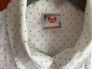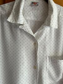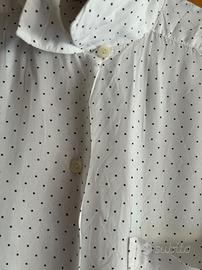 Camicia vintage (anni '90) Stefanel bianca con piccoli pois neri. Maniche lunghe, colletto, abbottonatura frontale e taschino. In viscosa 100%, made in Italy.