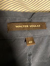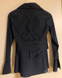 Elegante camicia da donna Walter Voulaz. - Colore blu intenso. - Taglia 40 (L). - Dettagli con ruches sul davanti. - Maniche lunghe con polsini ampi - cravattino staccabile
