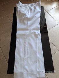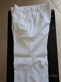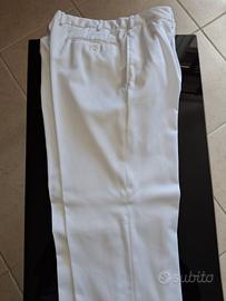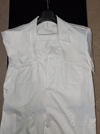 Camiciotto/Casacca bianca estiva completa di pantalone della Marina Militare. Abbottonatura con bottoncino e pantalone con pence e tasche a filetto. Il tessuto misto poliestere/viscosa è fresco, pettinato, morbido al tatto e cedevole quando indossato. Molto comoda ed ideale per chi è alto circa 180 e pesa circa 80/85 kg. Taglie disponibili 52 e 54, nuova, mai usata, in confezione originale. Singolo pezzo Euro 30.