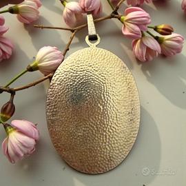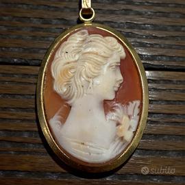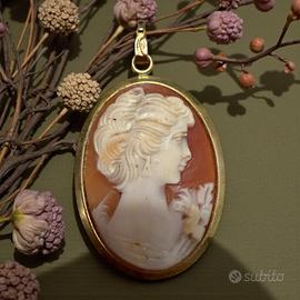 Una figura emerge dal fondo rosato della conchiglia come un pensiero trattenuto a lungo. Il profilo è lieve, raccolto, con i capelli mossi che sembrano seguire un ritmo antico, e un piccolo fiore che interrompe la linea del collo come un gesto intimo. Basta uno sguardo perché racconti un tempo in cui l’eleganza non era ostentazione, ma misura. Questo cammeo nasce in Italia, dove la conchiglia veniva incisa con pazienza, e trova poi una nuova vita in Francia, montato in plaqué or e destinato a essere indossato ogni giorno, vicino al cuore. Si percepisce ancora quella doppia anima: artigianale e borghese, delicata e concreta, pensata per accompagnare qualcuno nella vita quotidiana senza mai risultare eccessiva.