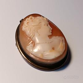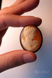 Splendido cammeo scolpito a mano su conchiglia naturale, caratterizzato da un affascinante profilo di donna in stile classico su un fondo color arancio intenso, che ne mette in risalto il rilievo.