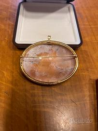 Cammeo antico di un prestigioso incisore Torrese realizzato a mano con tecniche ormai in disuso. Misura 60 mm e montatura in oro per ciondolo e/o spilla spessore 1 cm.