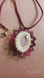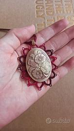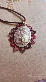 ciondolo cammeo fiori adornato da macramé artigianale francese. Mai indossato