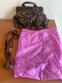Borsa marchio Camomilla marrone con fiocco, tripla cerniera, tracolla e custodia. La base misura cm 37x23.