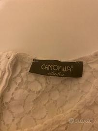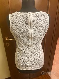 Top senza maniche realizzato in pizzo bianco/avorio con un motivo floreale traforato della collezione Camomilla Italia, brand noto per il suo stile "ladylike" che unisce eleganza classica e dettagli romantici. Realizzato in raffinato pizzo floreale all-over (pizzo macramè) pratico sottogiacca smanicato con scollo rotondo "paricollo". La silhouette è scivolata ma accostata al corpo, ideale per creare outfit stratificati. Tonalità avorio/bianco panna. Ideale sotto un blazer strutturato abbinato a jeans denim e un cardigan leggero oppure con una gonna a tubino o pantaloni per un'eleganza discreta. Eccellenti condizioni.
