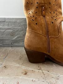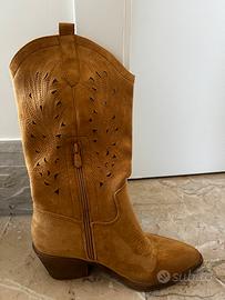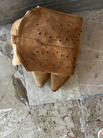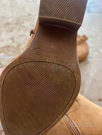 Vendo camperos scamosciati color cammello taglia 38. Utilizzati solo una volta. Vestibilità regolare. Chiusura a zip e inserti a taglio.