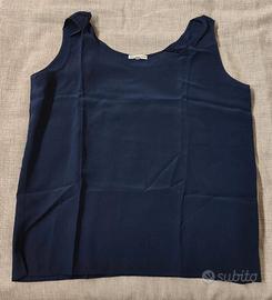 canotta da donna in 100% pura seta, colore blu scuro, taglia L (equivalente a 46 italiana). Tessuto leggerissimo e fresco, vestibilità morbida, scollo ampio e spacchetti laterali. Capo elegante e raffinato, ideale per primavera/estate o come sottogiacca. In ottime condizioni, solo da stirare.
