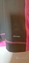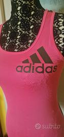 Canotta fitness Adidas in tessuto tecnico climalite. Elasticizzata. Tg XS, vestibilità comoda, può andare bene anche per una S. Colore fucsia sul davanti e verde militare sulla schiena. Spalle olimpioniche. Condizioni ottime, come nuova. Lunghezza 62 cm, da ascella ad ascella 34 cm.