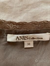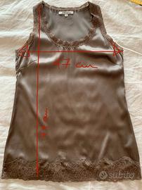 Canotta in seta (95%) con bordi in pizzo. Di color tortora, è della collezione Anis.E' stata indossata solo un paio di volte per cui è in ottime condizioni. La taglia è la 42.
