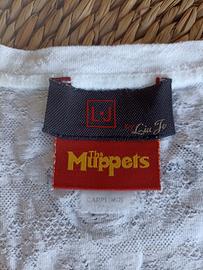 Canotta Liu Jo raffigurante Kermit la Rana (Kermit the Frog), il celebre personaggio dei Muppet. Edizione limitata di qualche anno fa, ora introvabile. Difetti: qualche strass mancante, si nota solo se guardi da vicino; leggero impallinamento nel bordo in basso dove è scritto Liu Jeans. Il prezzo tiene conto dei difetti sopra descritti. Il capo rimane comunque bello e raro. Canotta molto fresca. Descrizione immagine: Il disegno mostra Kermit vestito in modo elegante con smoking, papillon e cilindro. È raffigurato in una posa classica, simile a un artista di vaudeville, mentre tiene un bastone da passeggio. Il motivo è disegnato su un tessuto misto viscosa e poliammide. #canottadonna #canottaestiva #rana #themuppet #liujo