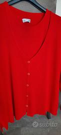 Vendo completo gemelli composto da canotta più cardigan, bellissimo color rosso vivo, che in foto non rende. Cardigan con spacchetti. Vestibilità morbida, elegante. Usato pochissime volte. Etichettato taglia L, 50% viscosa, 50% acrilico.