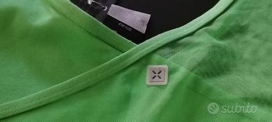 Canotta spalla larga incrociata con tessuto in rete fitta sovrapposta a tessuto di cotone fascia suo fianchi e coulisse. Color verde. Mela
