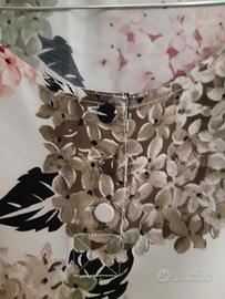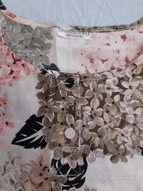 Canottiera in pura seta 100% usata pochissimo con motivo floreale e 3 bottoncino davanti più quello di scorta. In fondo è arrotondata per essere lasciata fuori. Misura da spalla a spalla cm 39 lunghezza canottiera cm 67.