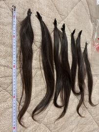 Vendo capelli veri naturali vergini, castano medio/scuro, mai tinti e mai trattati. Capelli sani, morbidi, con texture liscia leggermente mossa. Lunghezza totale 40 + cm; tagliati e consegnati ben legati in coda. Ideali per parrucche o extension. Disponibile spedizione in Italia. Tutte le ciocche sono comprese nel lotto di invio.