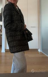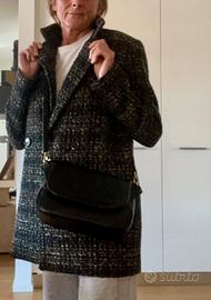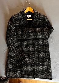 Cappotto tweed doppiopetto con 2 bottoni, dalla tipica lavorazione irregolare. Nelle tinte nero e marrone chiaro. Modello molto giovanile, indossabile con abbigliamento informale. Veste una taglia 42. È piuttosto leggero, quindi va bene nella mezza Stagione che è un po' meno fredda. Condizioni ottime. Spedizione veloce e accurata.