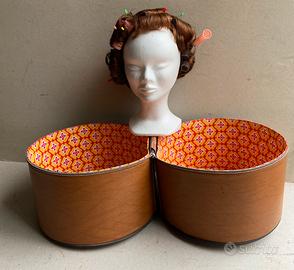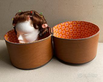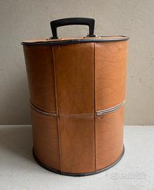 Cappelliera per la conservazione e il per il trasporto di parrucche e cappelli. Finitura in sky con chiusura a cerniera lampo, color marrone chiaro. Dimensioni circa: altezza cm. 38, diametro cm.31. Condizioni: ottime, come nuova.