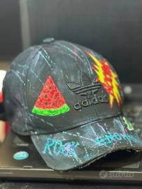 Cappellino Adidas nero con dettagli unici dipinti a mano: fetta di anguria e fiamma, per uno stile originale e divertente!