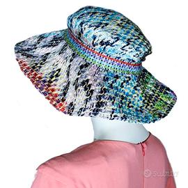 Un cappello formato da sottili fili di cotone colorati e intrecciati per formare i disegni di Missoni. Un nastro, sempre intrecciato, è alla base del cappello. Misura M