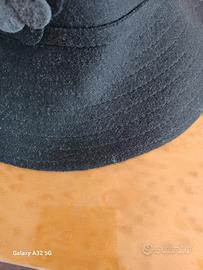 cappellino sfizioso nero in feltro, la tesa è impunturata, fiorellini grigi e neri impreziosiscono laterali. misura unica calza comodamente