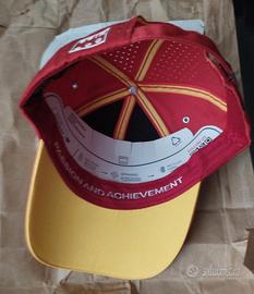 Cappellino Ferrari con loghi degli sponsor Ray-Ban e L'or. Colore rosso e giallo. Nuovo, mai usato e con cartellino.