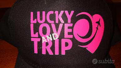 Vendo Cappellino Lucky Love and Trip, nero con scritta e disegno fluo, compreso 2 Braccialetti, nero e azzurro del marchio trandy del momento.