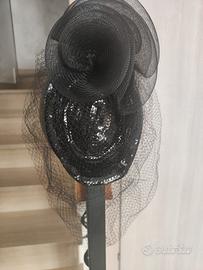 cappellino nero da cerimonia o cocktail con paillettes e velo creato dal marchio artigianale fiorentino Fratelli Andrei. da indossare sia frontalmente che lateralmente al capo.