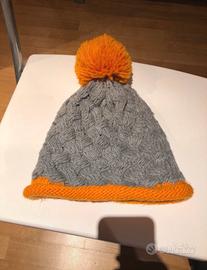 Cappellino in maglia con un vivace pompom. Design a trama intrecciata. Bordatura a coste arancioni.