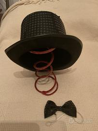 Cappello a cilindro nero da presentatore, da prestigiatore , da sera o da Carnevale. Con pailettes. Accompagnato da cravatta a farfalla , ugualmente con pailettes. Da adulto.