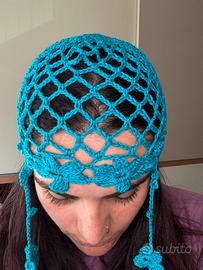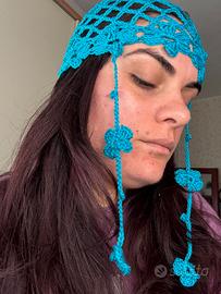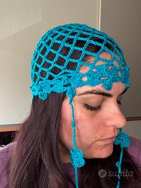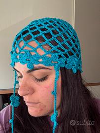 Cappello a rete azzurro con fiori e pendenti