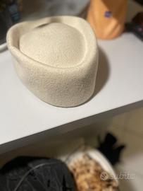 Cappello a tamburello in feltro color panna. Forma ovale con gross all’interno, di fattura artigianale. Diventato famoso negli anni 60, grazie a Jakie
