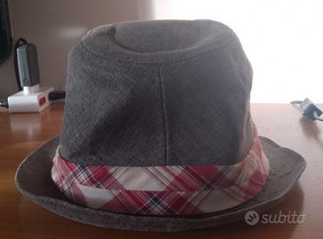 Cappello alla moda grigio con banda colorata bianca rossa e blu.