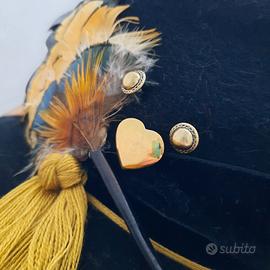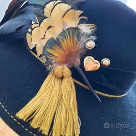 Cappello austriaco tradizionale anni '80 in feltro colore nero, con piume di fagiano, fascia velluto nero con relativo cordino e applicazioni come da foto.