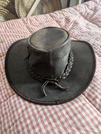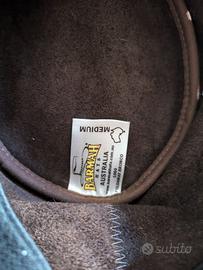 Cappello australiano a tesa larga realizzato in morbida pelle bovina australiana di qualità superiore cerata e oliata con fascia in pelle intrecciata. Trattato con una finitura oliata per renderlo super resistente alle intemperie, liscio sulla mano e molto resistente. La sua pelle unica con un aspetto vissuto che lo fa sembrare usato. Il cappello è sfoderato, ma ha una fascia tergisudore elastica per offrire un maggior confort nella calzata, dotato di occhielli laterali per la circolazione dell'aria. Resistente alle intemperie e idrorepellente. Pieghevole e ideale per viaggiare.