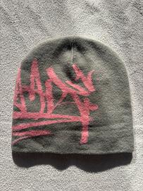 beanie grigio in caldo cotone, decorato da un grafismo effetto graffiti rosa che richiama le vibes street e underground.